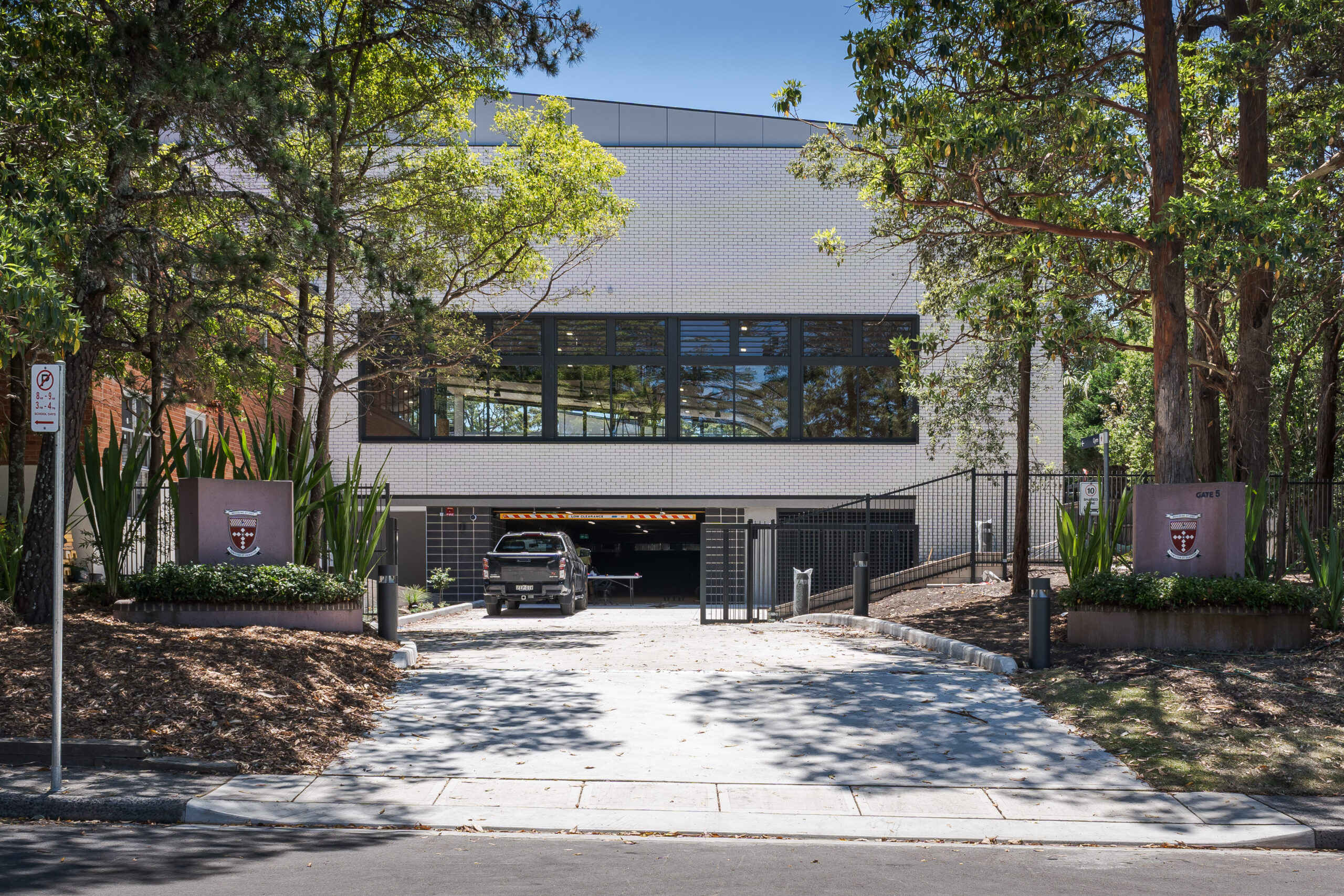 The building features curved steel roof beams and fire separation walls, basement carpark, change facilities, staff rooms, sports storage, and first aid room. The design accommodates administrative needs with integrated office spaces for PDHPE and Sports staff. ​