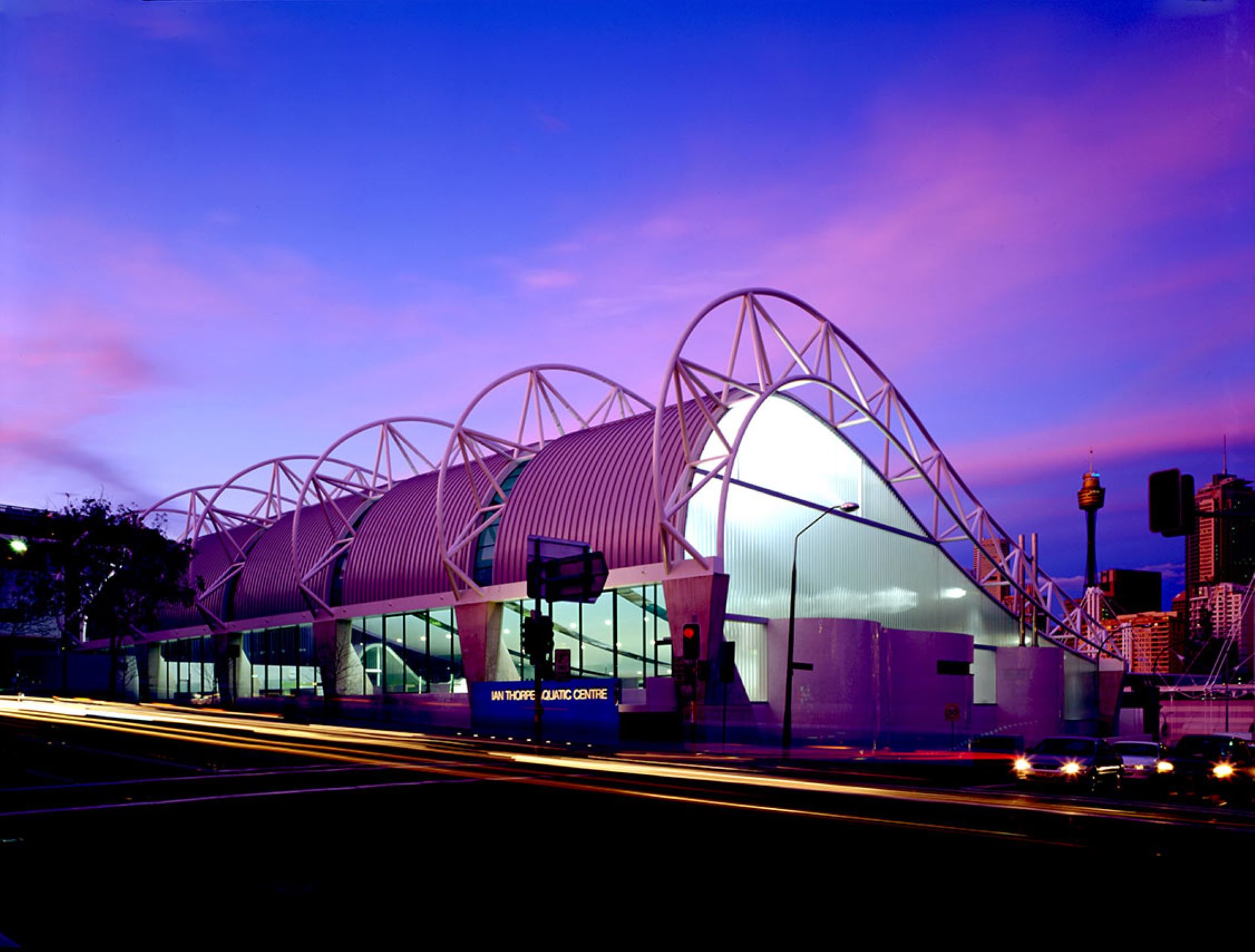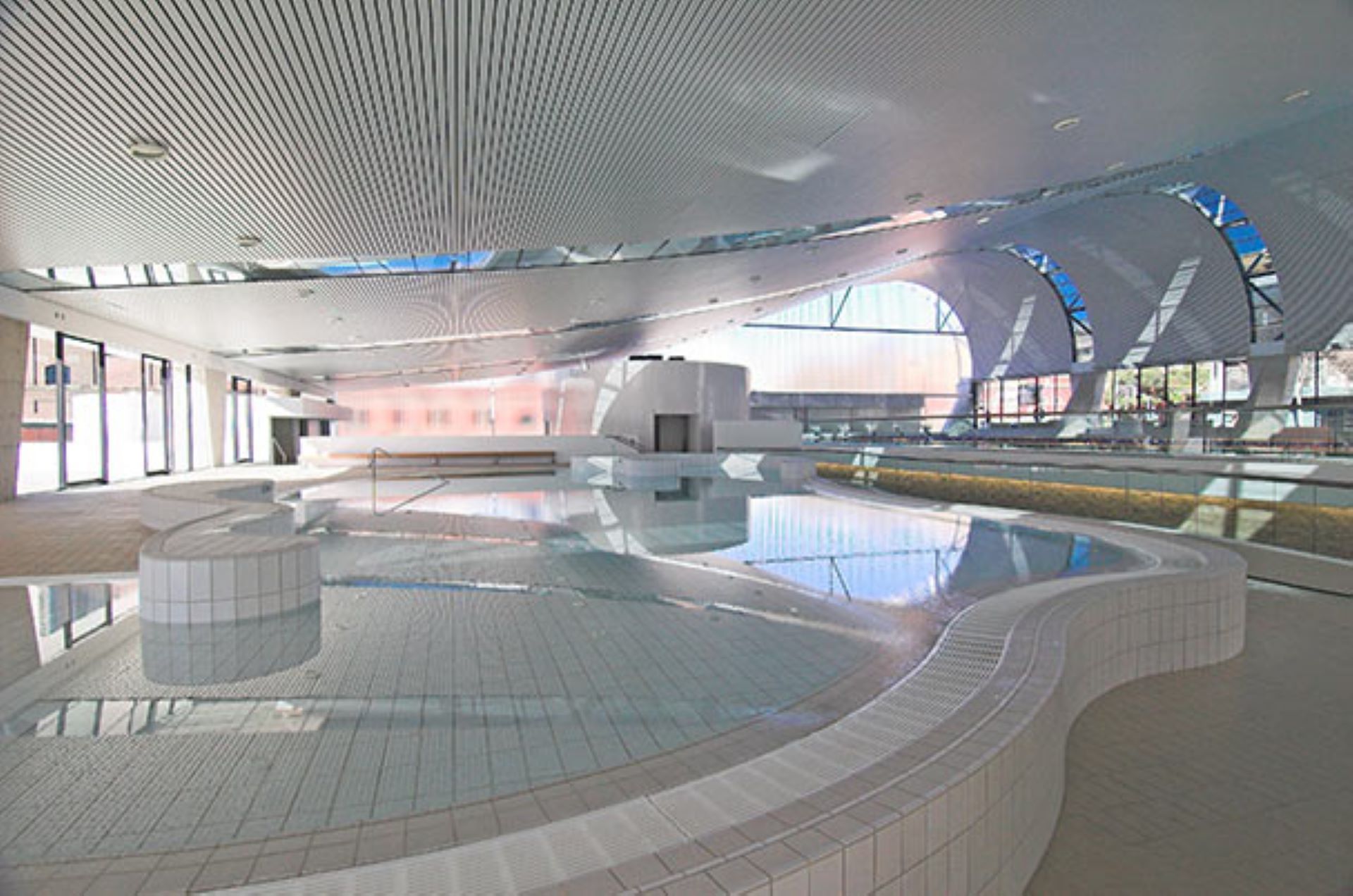 Working alongside renowned architect Harry Seidler, this aquatic centre features sweeping curved steel trusses spanning three major pool areas across multiple levels. The structural framework creates unobstructed views throughout the facility while bringing in substantial Sydney skyline views and natural daylight.