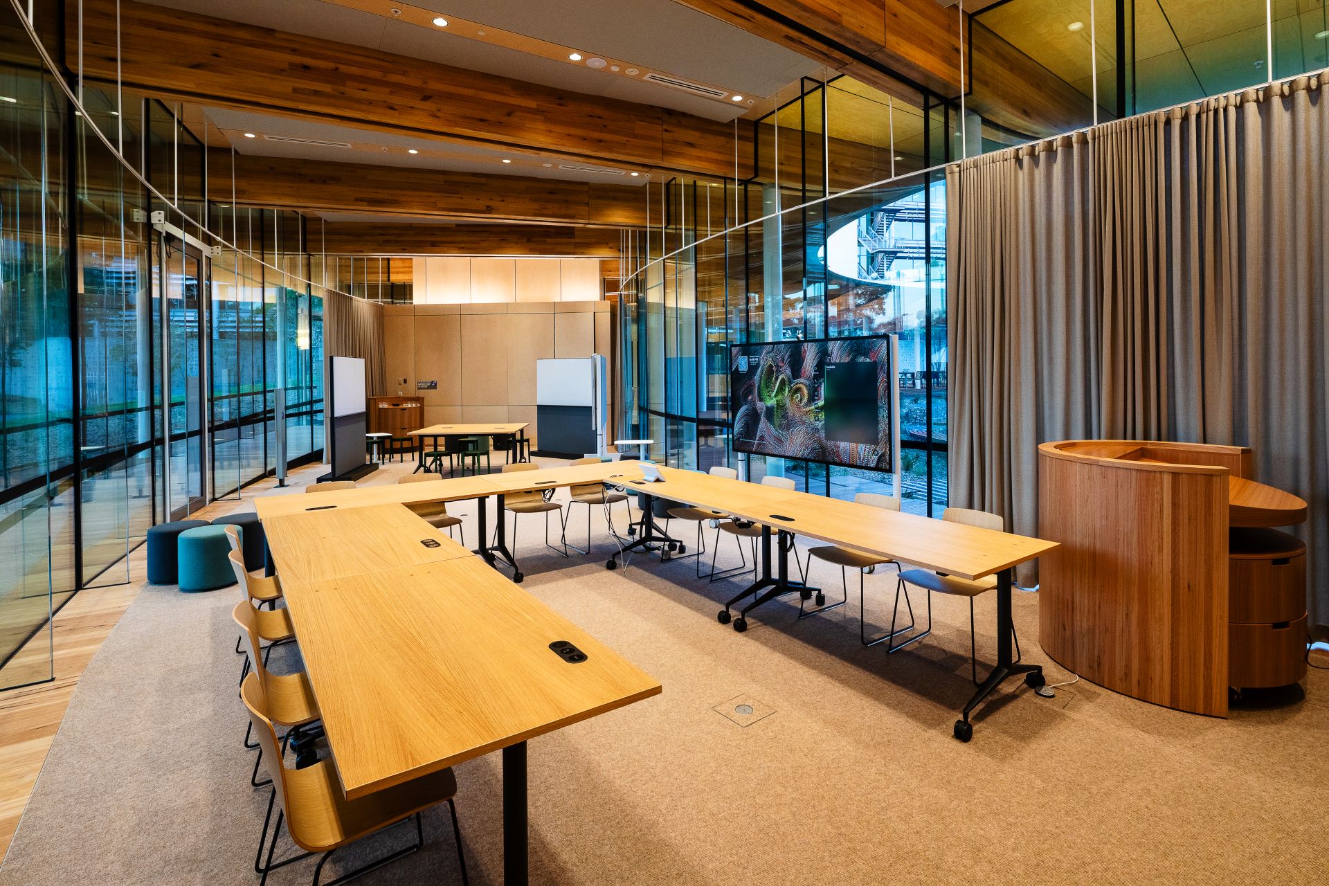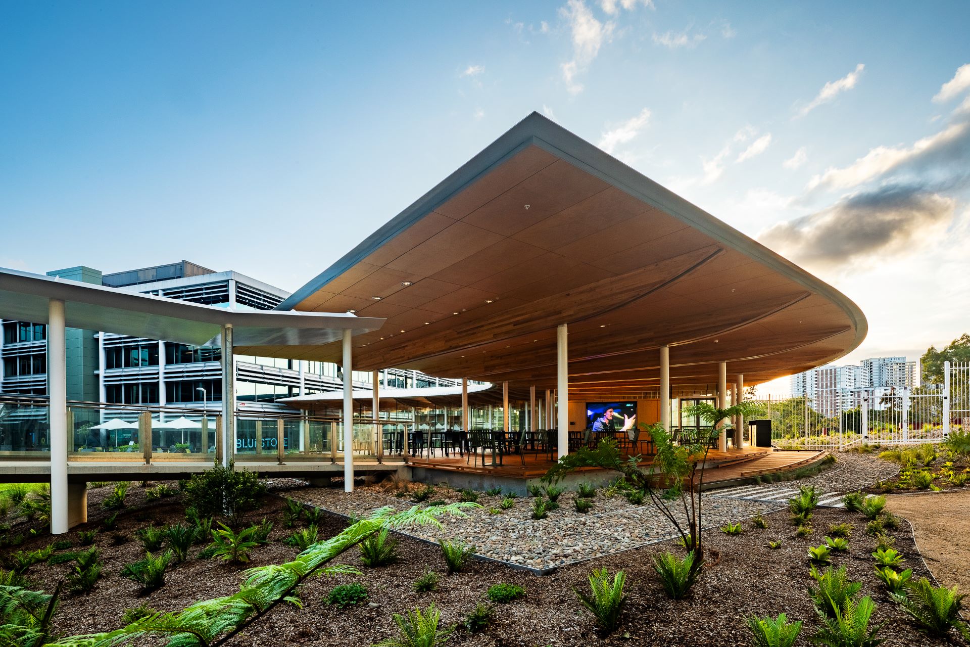 The O Pavilion provides a central gathering space for Optus staff and visitors at their Macquarie Park campus. Working with Architectus and Grindley Constructions, we engineered the distinctive timber canopy structure while maintaining completely open interior spaces for maximum flexibility. The key challenge was integrating new infrastructure with the existing campus operations without disruption. Our structural approach supports both the architectural vision and Optus’s need for adaptable collaborative spaces.Â